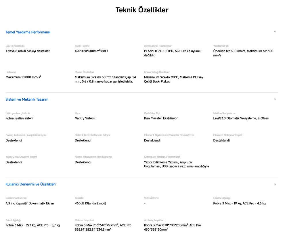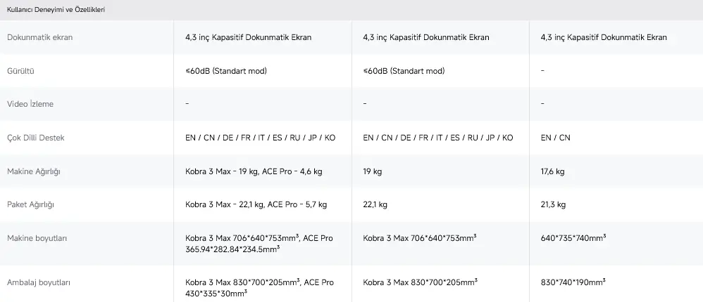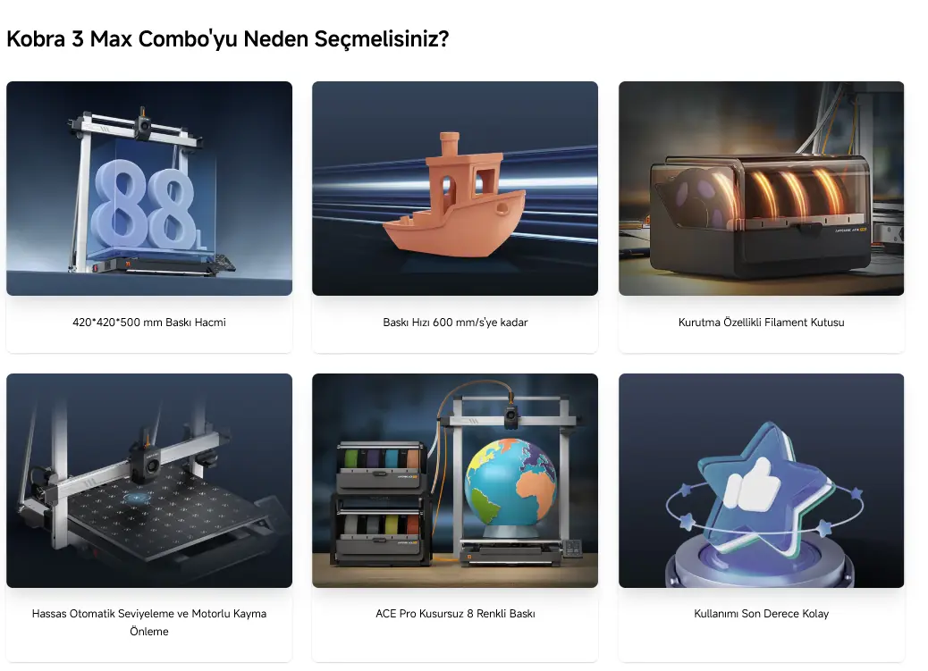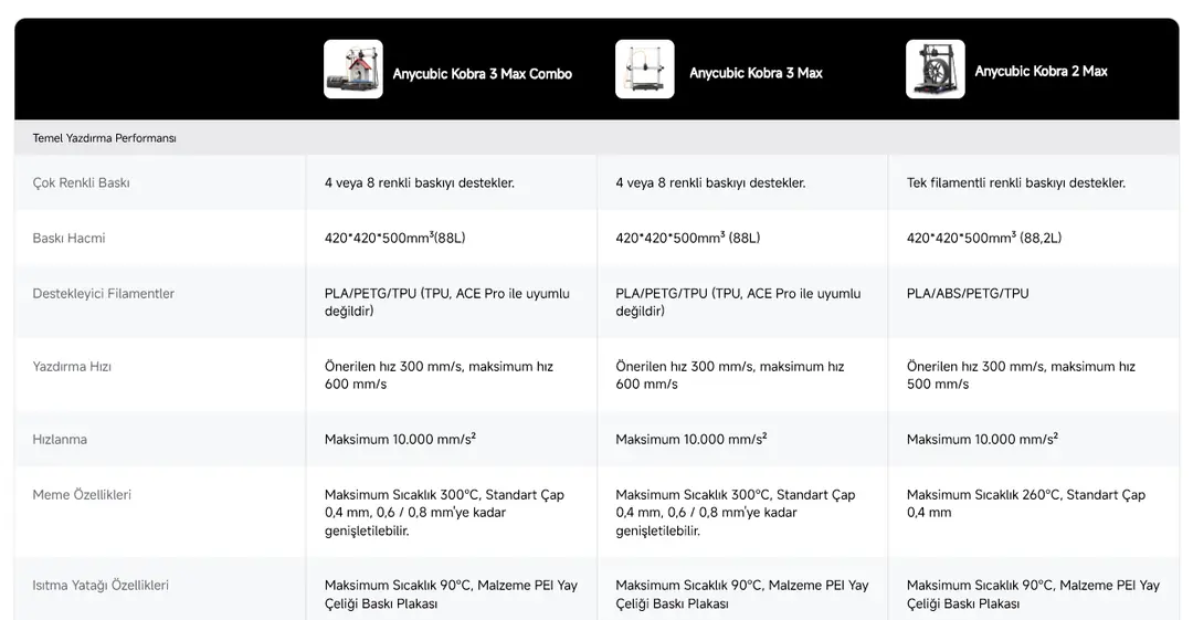 Bu özellikler, Anycubic Kobra 3 Max Combo 3D Yazıcı’yı hem hobi hem de profesyonel kullanıcılar için ideal bir seçim haline getirir.